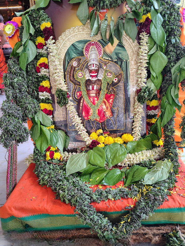 ஆஞ்சநேயரின் திருவடிகளில் தாமரை மலர் போன்ற தண்டை அணிந்தும், வலக் கரத்தில் சுதர்சன சக்கரம் பொறிக்கப்பட்டு ஆசீர்வாதம் செய்யும் நிலையிலும், இடக் கரத்தில் சவுகந்திக மலரை ஏந்தியபடி தொடையில் ஊன்றிக் காட்சி தருகிறார். ஆஞ்சநேயரின் வால், ஆஞ்சநேயரின் தலைப்பகுதிக்குப் பின்புறம் இடப்புறமாக மேல் நோக்கி நீண்டிருக்க, வாலின் நுனியில் மணி கட்டப்பட்டிருக்கிறது. ஆஞ்சநேயரின் வாலுக்கு நவகிரகங்களைக் கட்டுப்படுத்தும் ஆற்றல் இருப்பதாக ஐதீகம். வாலின் நுனியில் உள்ள மணியை மானசீகமாக வழிபட்டு வேண்டிக்கொண்டால், நவகிரக தோஷங்கள் விலகிவிடும் என்பது பக்தர்களின் நம்பிக்கை.