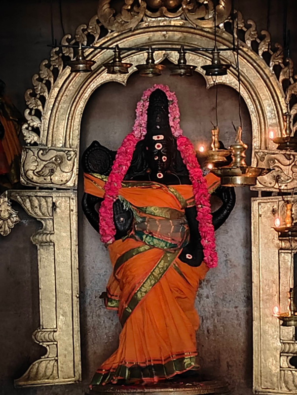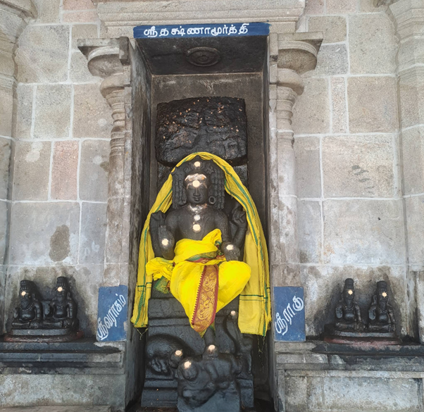 பொதுவாக சிவாலயங்களில், சுற்று சுவற்றில் காட்சி தரும் தட்சிணாமூர்த்தியின் காலடியில் முயலகன் இருப்பார். ஆனால் இத்தலத்தில் காலடியில் முயலகன் மட்டுமின்றி ராகுவும் இருப்பது ஒரு விசேடமான அம்சமாகும். இவரை வழிபட குரு, நாகதோஷம் நீங்கும். தட்சிணாமூர்த்திக்குப் பக்கத்து சுவரில் திருமால் வெண் பன்றியாக இருந்து தாமரை மலர்களைக் கொண்டு வழிபடும் ஐதீக சிற்பம் உள்ளது.