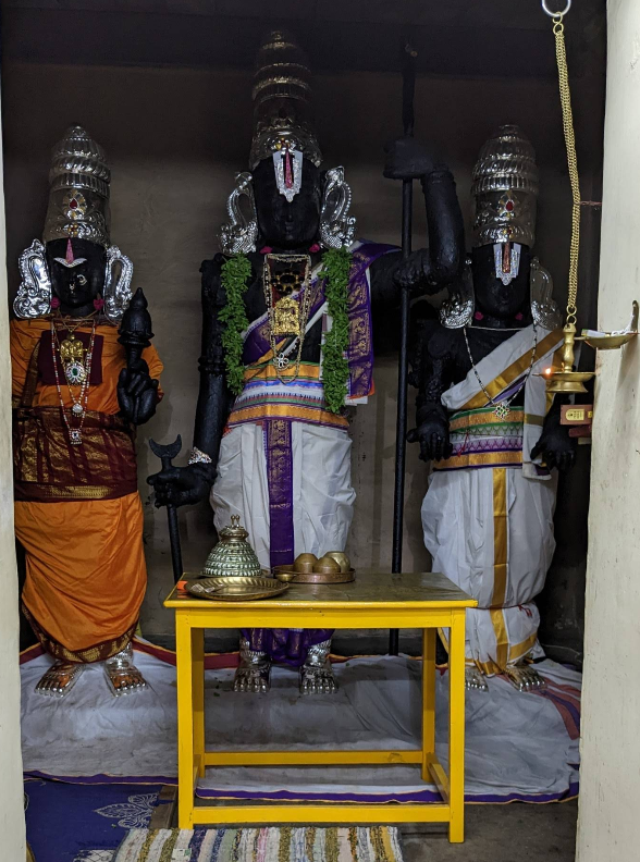 கருவறையில் கிட்டத்தட்ட எட்டடி உயரத்தில் ஆஜானுபாகுவாகக் கைகளில் வில்லும் அம்பும் ஏந்தி, இதழோரத்தில் குறுநகை பொலியக் காட்சி தருகிறார் ராமபிரான். உடன் ஆயுதமின்றி லக்ஷ்மணர் தனது வலது கரம் வில்லைப் பிடிப்பதைப் போன்ற பாவனையிலும், சீதா பிராட்டி கையில் தாமரை மலர் ஏந்திய கோலத்திலும் விளங்குகின்றனர். இந்த விக்கிரகங்கள் அனைத்தும் சுதையால் செயப்பட்டுள்ளன.